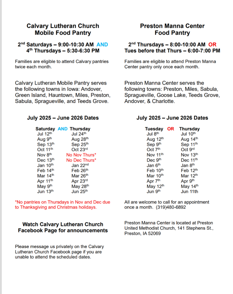 At Calvary Lutheran Church of Sabula, we believe that nourishment is more than food, it’s a sign of community, compassion, and God’s care for each person. That’s why we operate a mobile food pantry supported by St. Stephen’s Branch of River Bend Food Bank, meeting the needs of our neighbors with dignity, respect, and service.