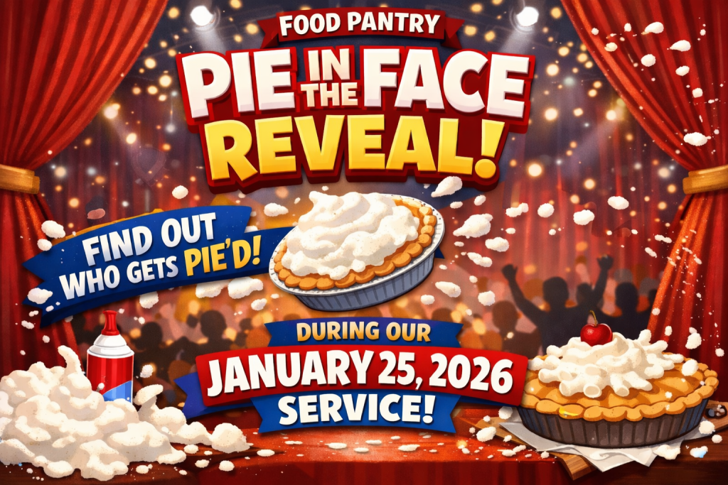 Join us during worship on Sunday, January 25, 2026, as we reveal the final results of our Food Pantry Pie in the Face fundraiser.